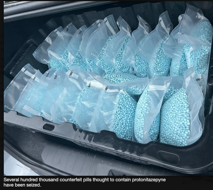 Some illicit pills intercepted during the investigation by our police officers resembled legitimate oxycodone pills. They were blue and bore the inscription M/30. Laboratory analysis showed, however, that unlike the original drug, the counterfeit pills contained protonitazepyne, a synthetic opioid around 25 times more potent than fentanyl. This drug is a central nervous system depressant. Laboratory analysis will be required to determine whether there is protonitazepyne in the pills seized today.