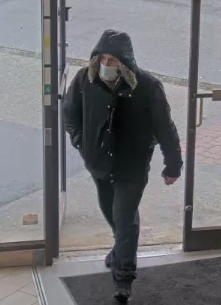 The suspect is described as a Caucasian male who is approximately 5-foot-8 with a stocky build. He was wearing a wearing a black coat with fur around the hood, black pants, black sneakers and a black backpack. He had on a surgical face mask.