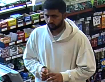 The suspect is described as a man approximately 20 to 30 years old, between 5’8” and 5’11” tall, between 150 and 200 pounds, with a medium build, short black hair and black facial hair. He was last seen wearing a white Puma hoodie, blue or grey pants and grey running shoes.