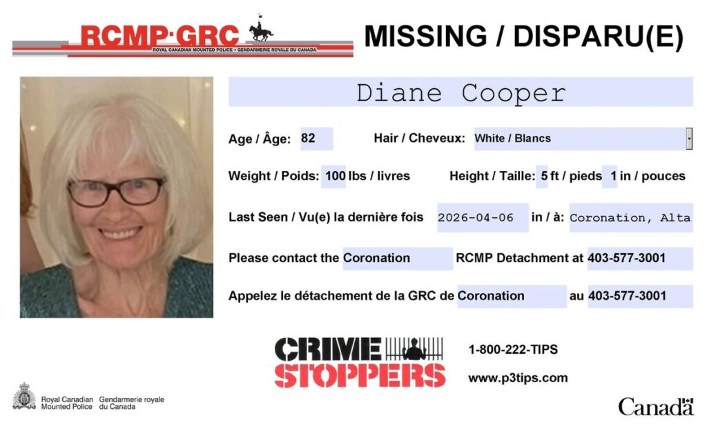 Consort RCMP is advising that Diane Cooper was located by RCMP in the RM of Grandview, near Kindersley, SK, on April 18, 2026, at approximately 7:40 p.m. Unfortunately, she was located deceased. Her dog Halo was also located, and he is safe. The circumstances surrounding her death are not suspicious.